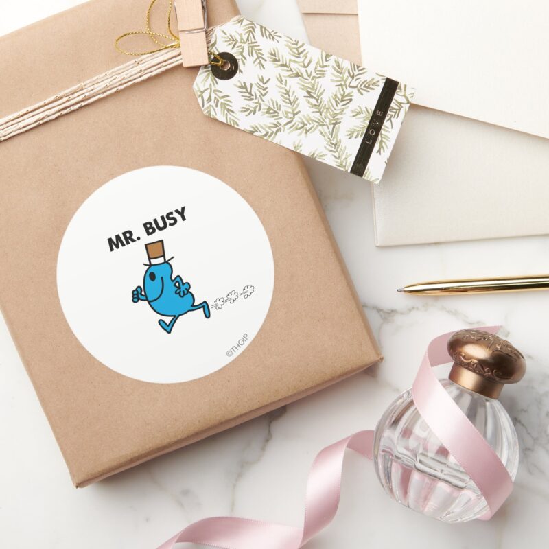 Mr. Busy Running Quickly Classic Round Sticker vinyl sticker, waterproof durable collectible sticker for laptop, phone, bottle, bike, notebook, helmet, and accessories.