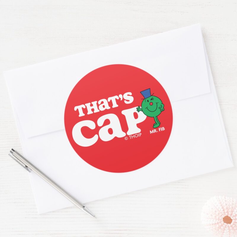 Mr. Fib Thats Cap Classic Round Sticker vinyl sticker, waterproof durable collectible sticker for laptop, phone, bottle, bike, notebook, helmet, and accessories.