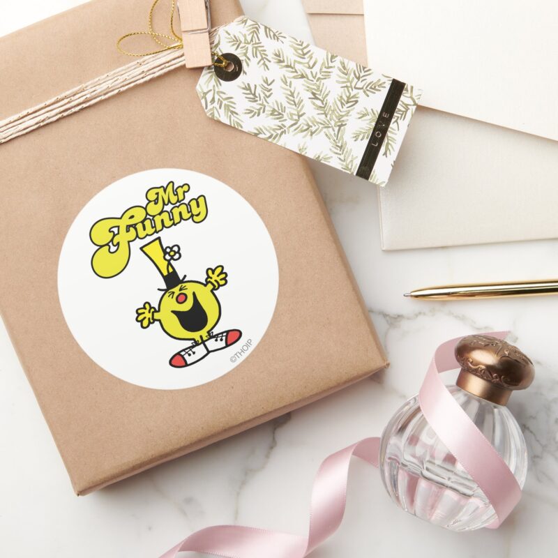 Mr. Funny Laughing Hysterically Classic Round Sticker vinyl sticker, waterproof durable collectible sticker for laptop, phone, bottle, bike, notebook, helmet, and accessories.