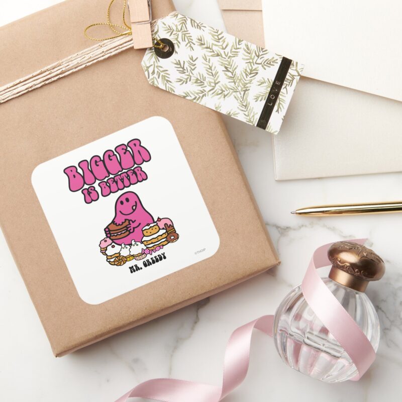 Mr. Greedy Bigger Is Better Square Sticker vinyl sticker, waterproof durable collectible sticker for laptop, phone, bottle, bike, notebook, helmet, and accessories.