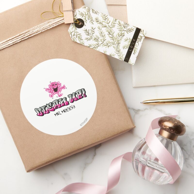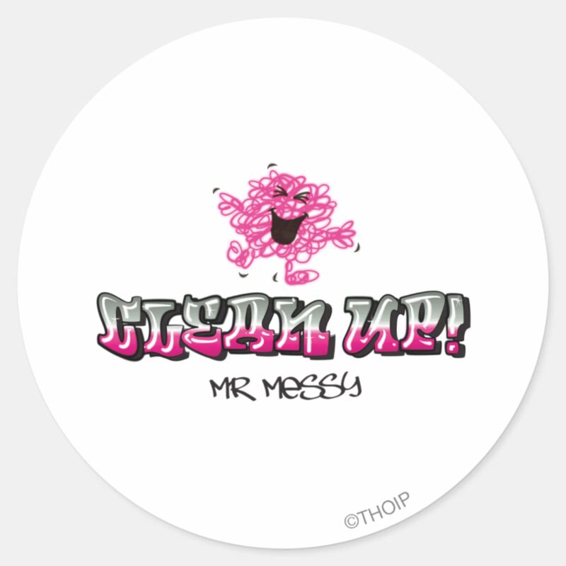 Mr. Messy Says Clean Up Classic Round Sticker vinyl sticker, waterproof durable collectible sticker for laptop, phone, bottle, bike, notebook, helmet, and accessories.