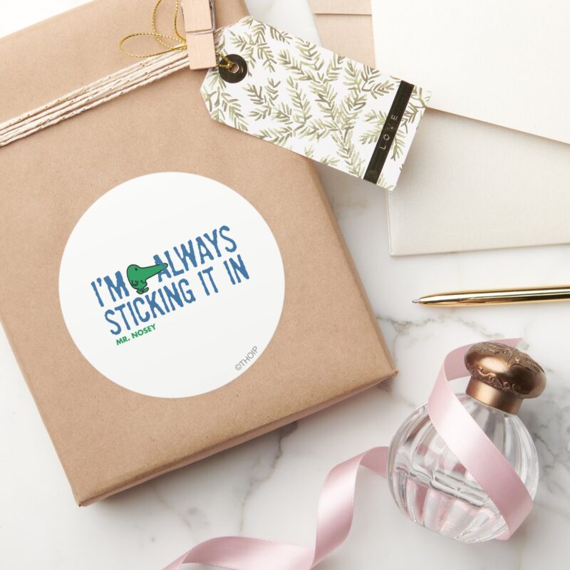Mr. Nosey Nosing Around Blue Lettering Classic Round Sticker vinyl sticker, waterproof durable collectible sticker for laptop, phone, bottle, bike, notebook, helmet, and accessories.