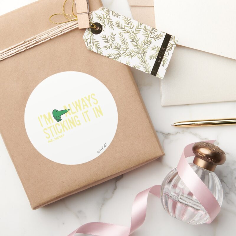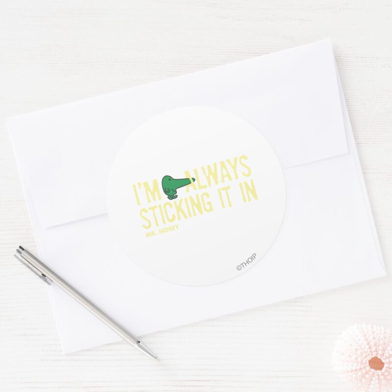 Mr. Nosey Nosing Around Yellow Lettering Classic Round Sticker vinyl sticker, waterproof durable collectible sticker for laptop, phone, bottle, bike, notebook, helmet, and accessories.