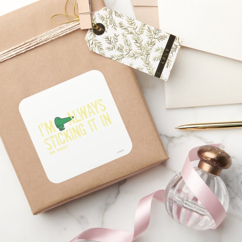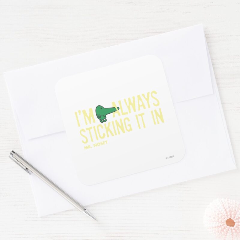 Mr. Nosey Nosing Around Yellow Lettering Square Sticker