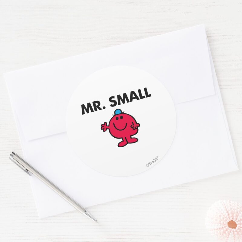 Mr. Small Waving Hello Classic Round Sticker vinyl sticker, waterproof durable collectible sticker for laptop, phone, bottle, bike, notebook, helmet, and accessories.