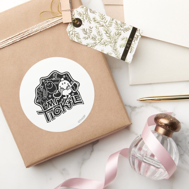 Mr. Tickle Black White Fun Classic Round Sticker vinyl sticker, waterproof durable collectible sticker for laptop, phone, bottle, bike, notebook, helmet, and accessories.