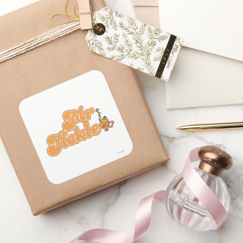 Mr. Tickle Long Wave Hello Square Sticker vinyl sticker, waterproof durable collectible sticker for laptop, phone, bottle, bike, notebook, helmet, and accessories.