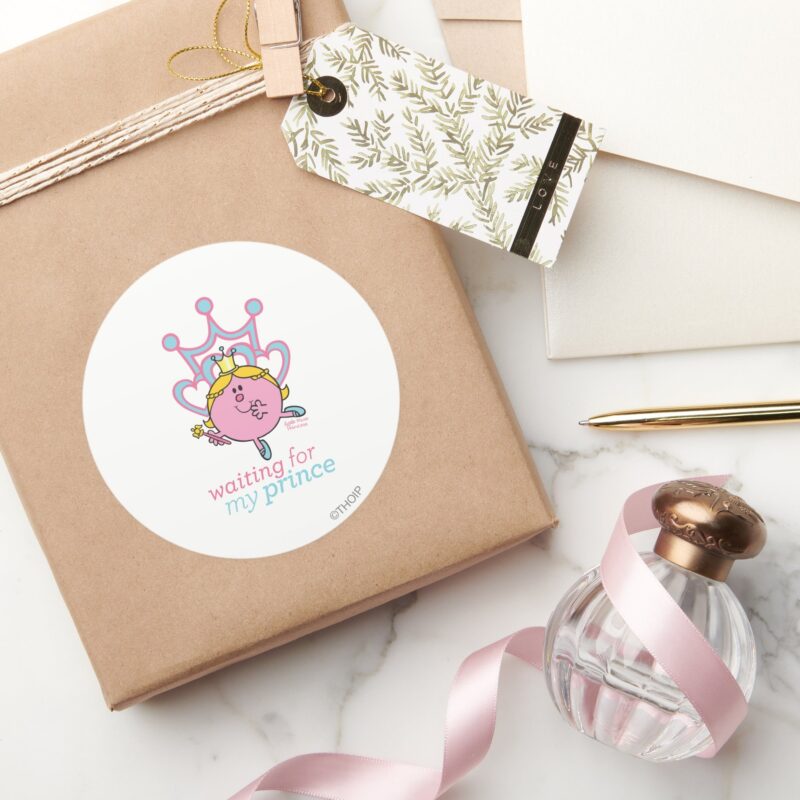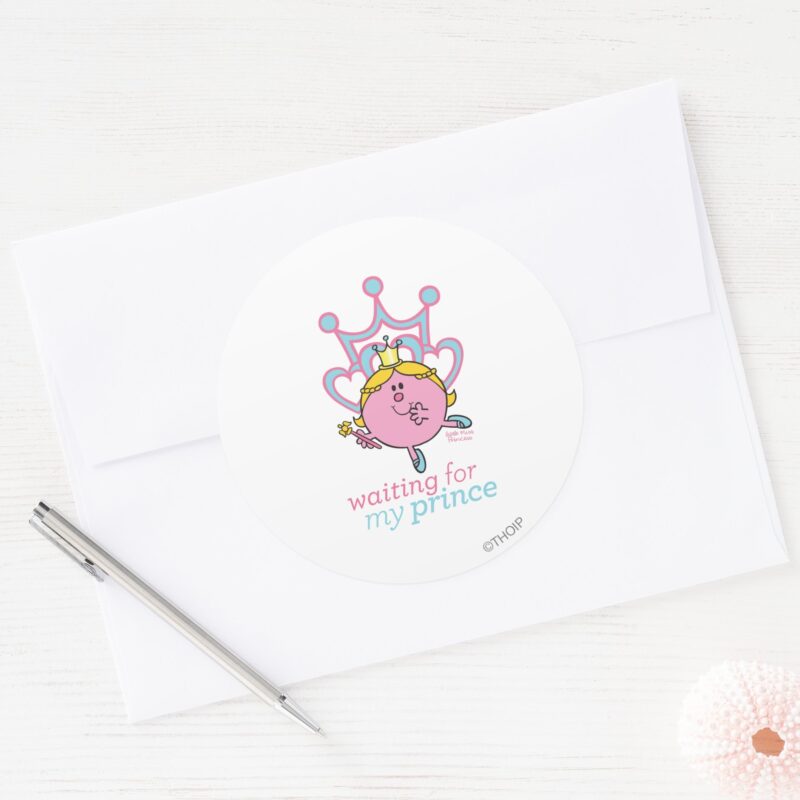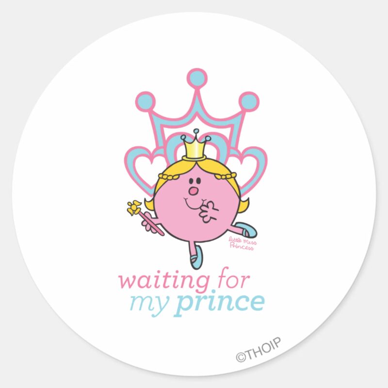 Waiting For My Prince Classic Round Sticker vinyl sticker, waterproof durable collectible sticker for laptop, phone, bottle, bike, notebook, helmet, and accessories.