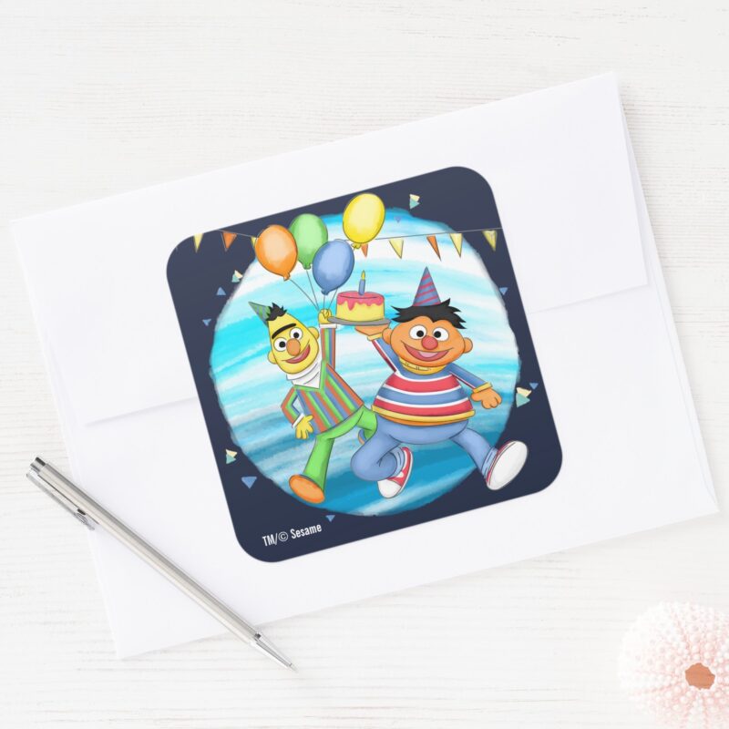 Bert And Ernie Birthday Balloons Square Sticker vinyl sticker, waterproof durable collectible sticker for laptop, phone, bottle, bike, notebook, helmet, and accessories.