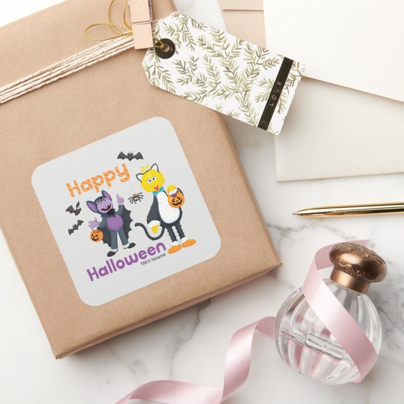 Big Bird And Count Happy Halloween Square Sticker vinyl sticker, waterproof durable collectible sticker for laptop, phone, bottle, bike, notebook, helmet, and accessories.