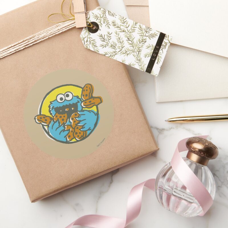 Cookie Monster Retro Classic Round Sticker vinyl sticker, waterproof durable collectible sticker for laptop, phone, bottle, bike, notebook, helmet, and accessories.