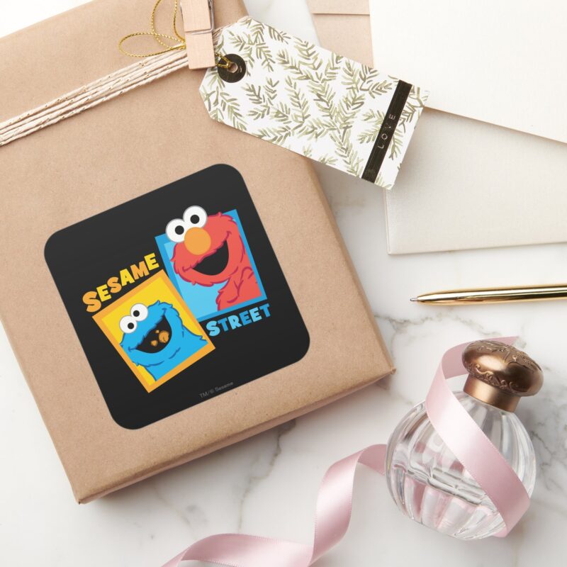 Elmo And Cookie Monster Friends Square Sticker vinyl sticker, waterproof durable collectible sticker for laptop, phone, bottle, bike, notebook, helmet, and accessories.