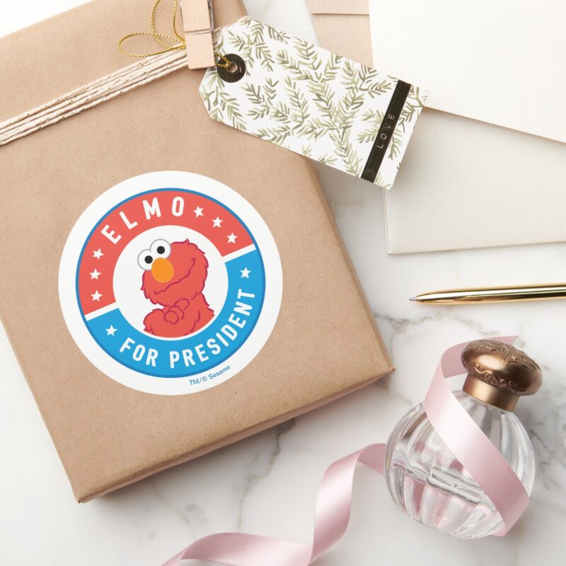 Elmo For President Badge Classic Round Sticker vinyl sticker, waterproof durable collectible sticker for laptop, phone, bottle, bike, notebook, helmet, and accessories.