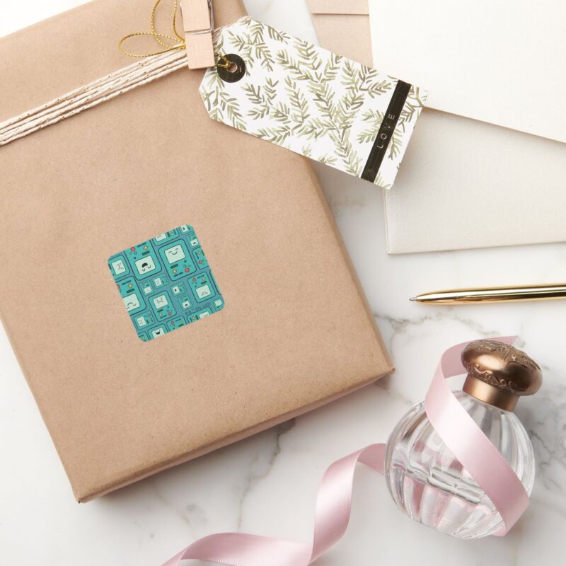 Adventure Time BMO Pattern Square Sticker vinyl sticker, waterproof durable collectible sticker for laptop, phone, bottle, bike, notebook, helmet, and accessories.