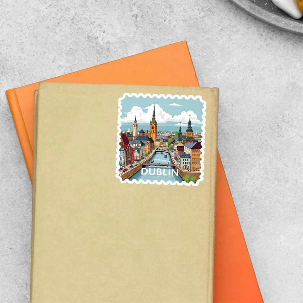 Dublin Historic City And Clock Tower Post Stamp Travels Stickers vinyl sticker, waterproof durable collectible sticker for laptop, phone, bottle, bike, notebook, helmet, and accessories.